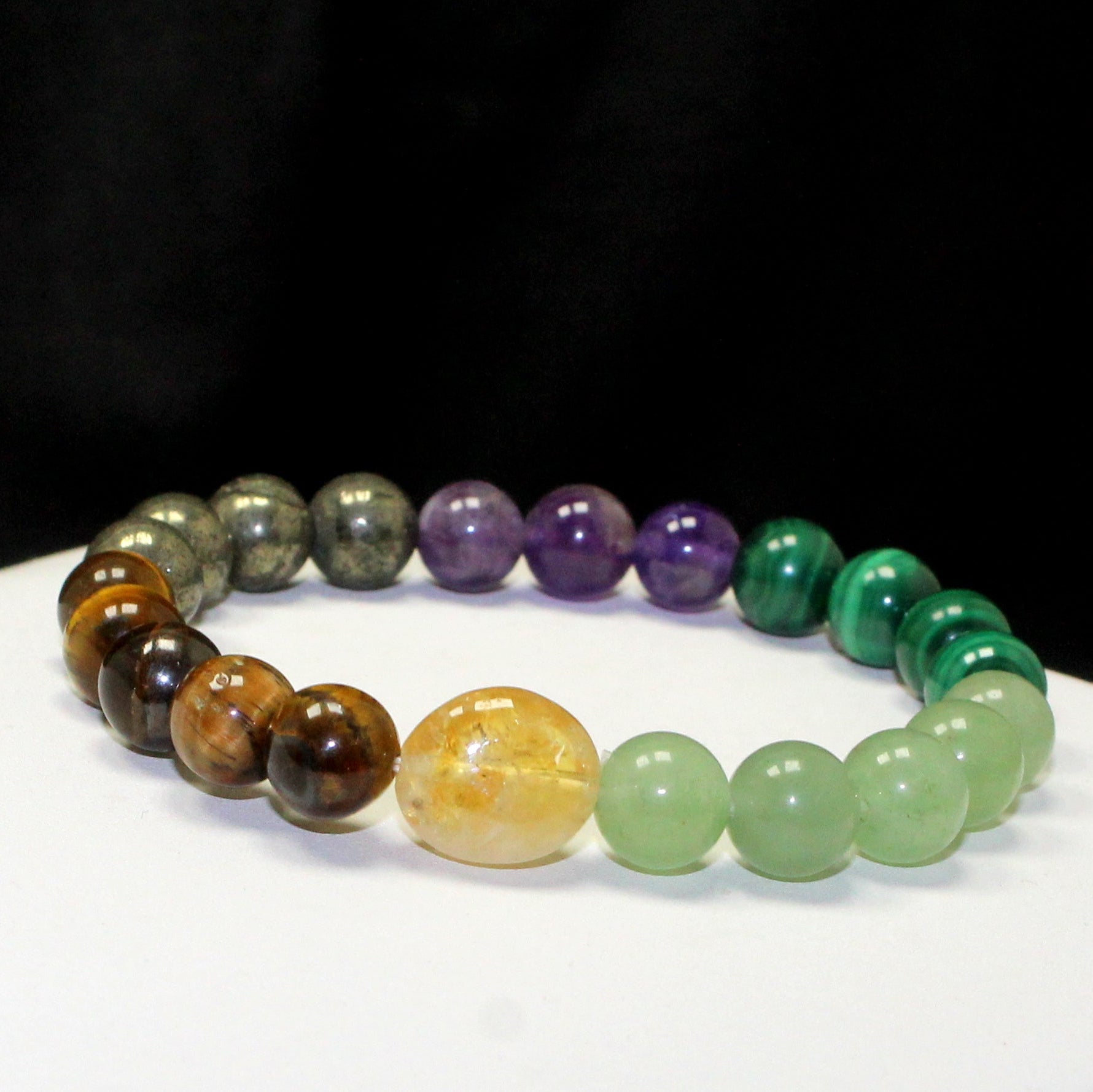 Unlock abundance and attract prosperity with our handcrafted Wealth Bracelet. Made from premium natural crystals such as Citrine, Green Aventurine, Malachite, Tiger Eye, Pyrite and Amethyst this bracelet is designed to enhance financial energy, promote success, and invite good fortune into your life.