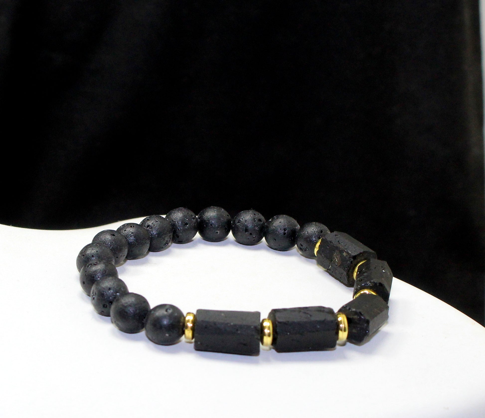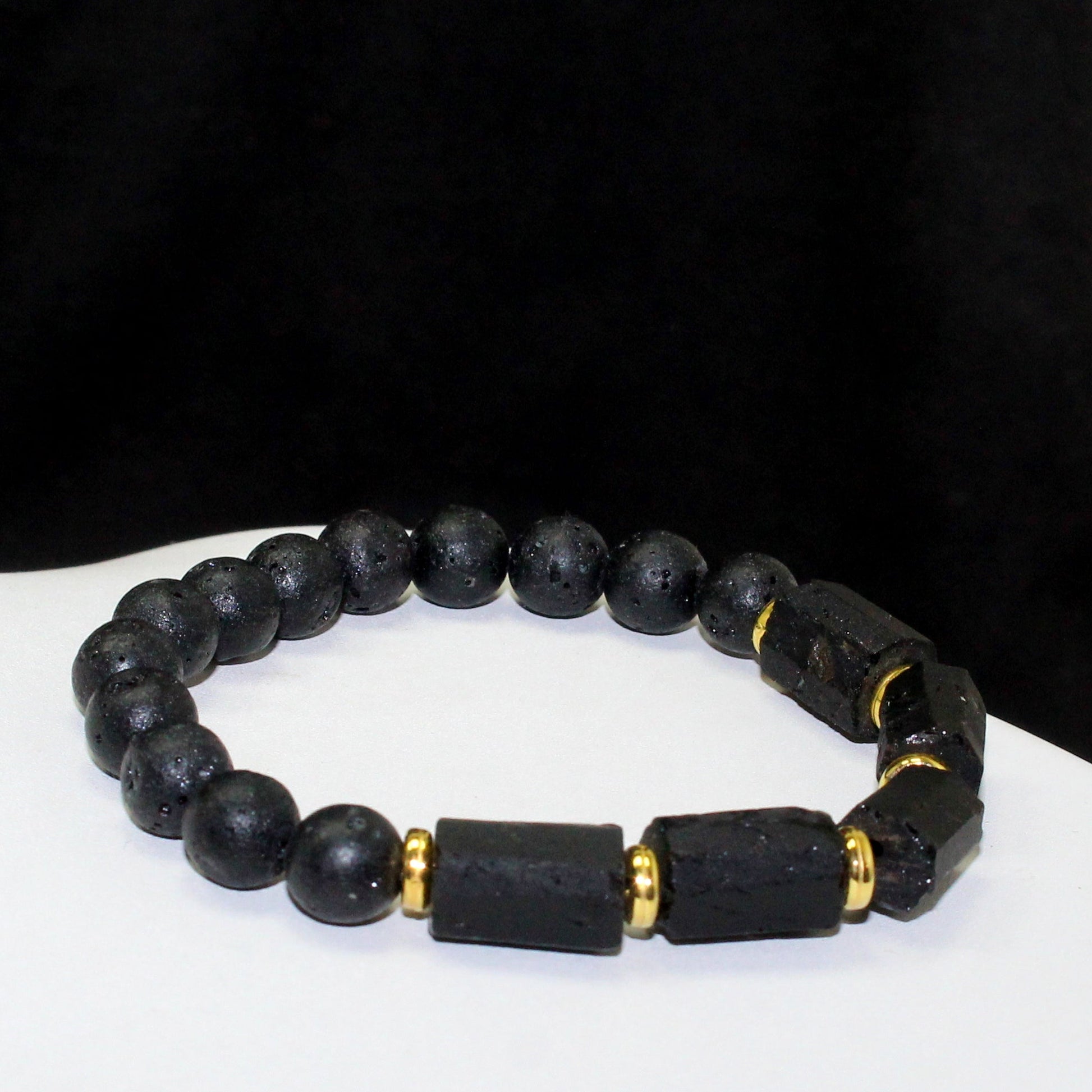 This Black Tourmaline and Lava Rock Bead Bracelet features natural stones known for their grounding and protective properties. Crafted with black tourmaline and lava stone, it can help to alleviate stress, promote inner peace, and provide balance and stability. A stylish and beneficial addition to any accessory collection.