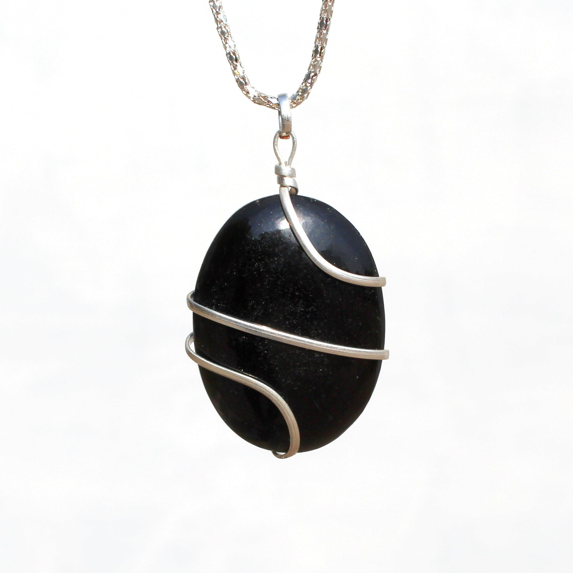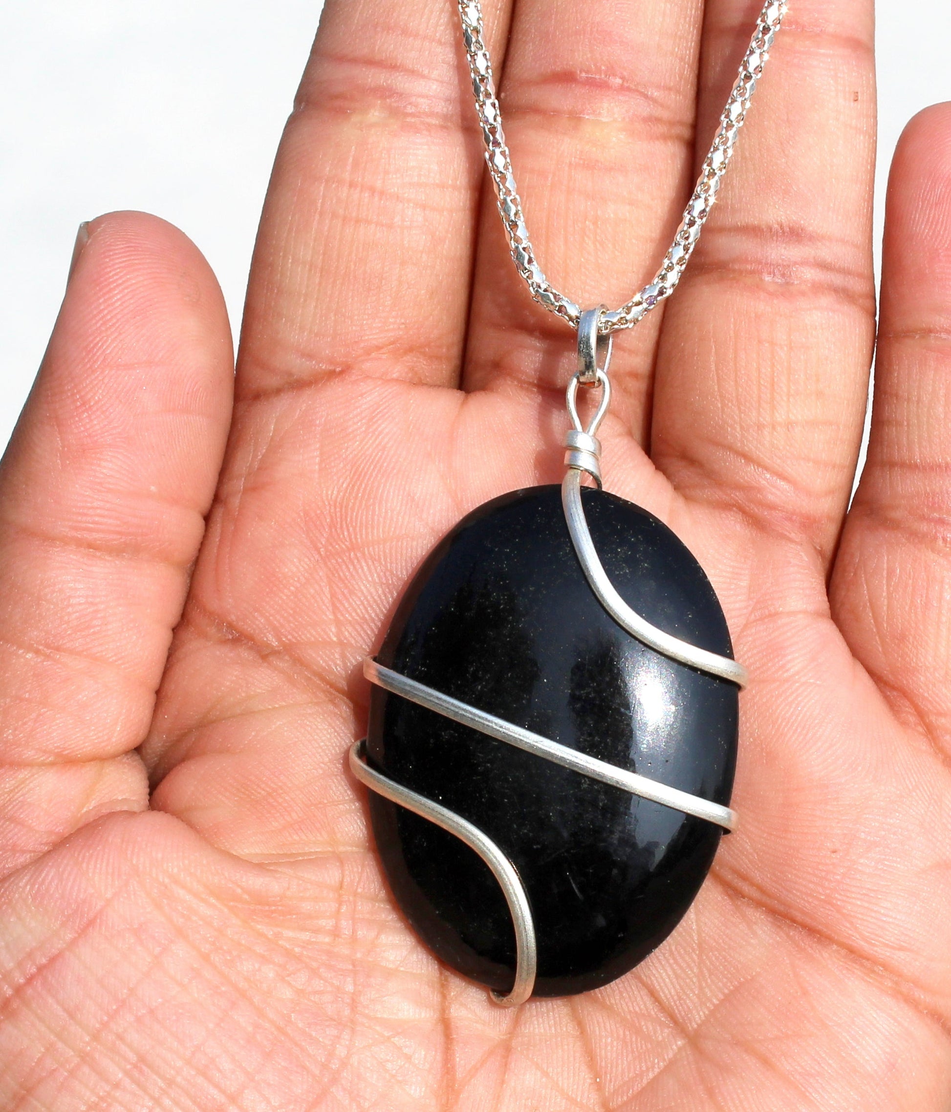 Natural Black Tourmaline Oval Wire Wrapped Pendant