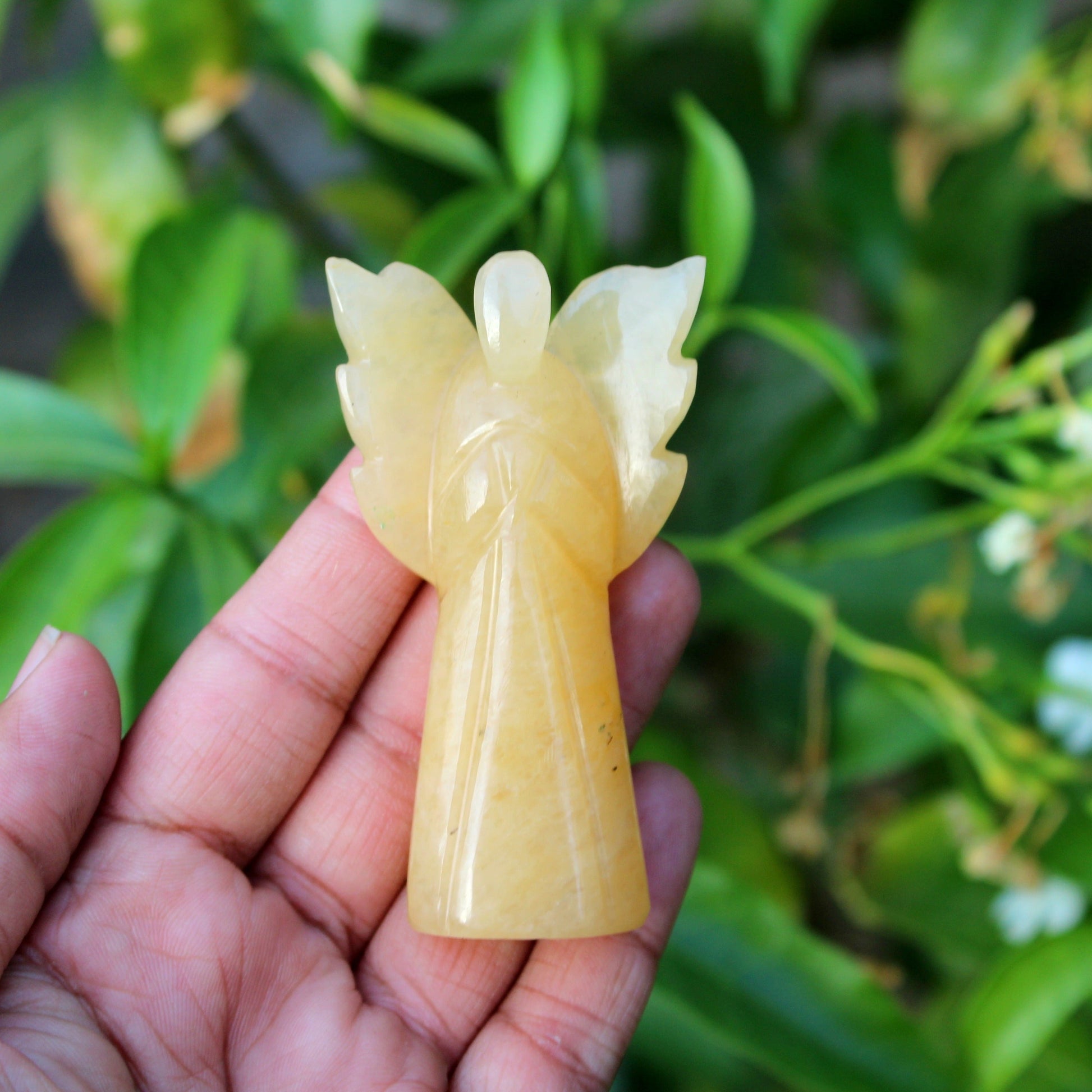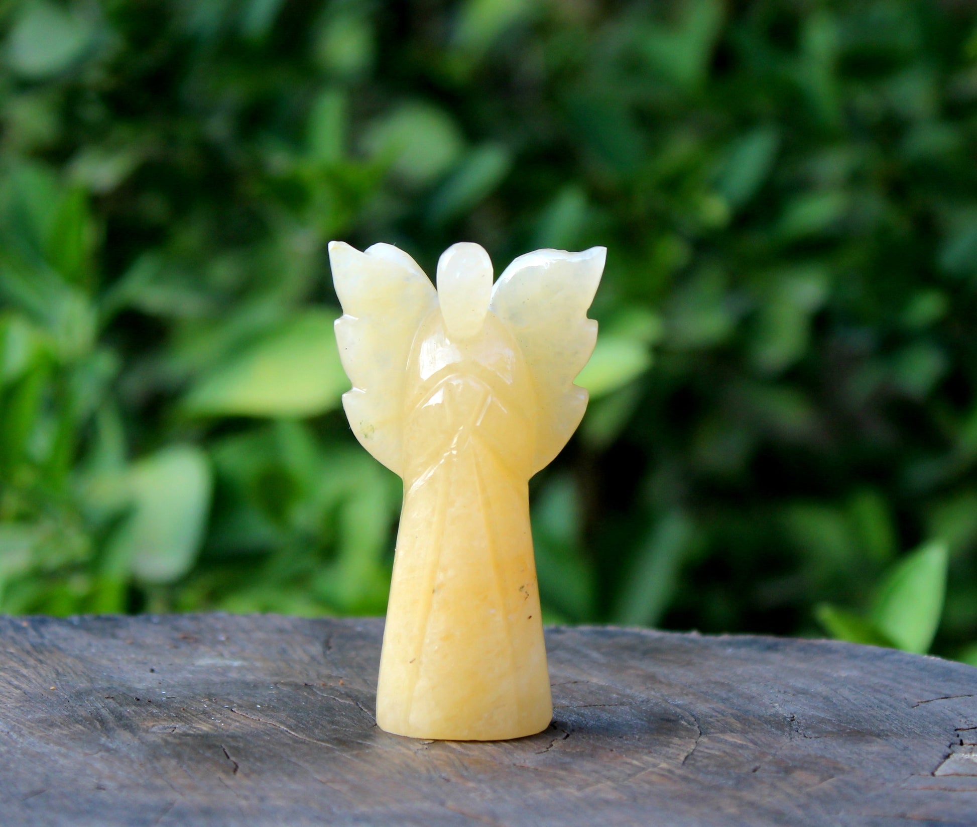 This Natural Hand Carved Yellow Aventurine Angel is an excellent addition to your home decor. The yellow aventurine stone is believed to activate the Solar Plexus Chakra, providing a boost of energy and joy to your environment. Its delightful design will be the perfect accent in any home.